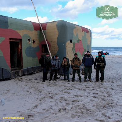 Po krótkiej odprawie ruszamy ku naszej przygodzie. Przy takim dystansie preferujemy start w stylu Hudson Bay Company. Polega on na przejściu niewielkiego odcinka szlaku a następnie rozłożeniu obozu w celu upewnienia się, że wszystko zabraliśmy. Tak robili wioślarze wielkich canoe transportowych na terytorium obecnej Kanady. W naszym przypadku to czas na przejrzenie dopasowania sprzętu, ewentualnym dopasowaniu warstw odzieży do marszu w panujących warunkach. Jednocześnie zatrzymaliśmy się w pierwszym z historycznych miejsc, przy schronie amunicyjnym Baterii Przeciwdesantowej nr 43, usytuowanej tutaj w 1939 roku.